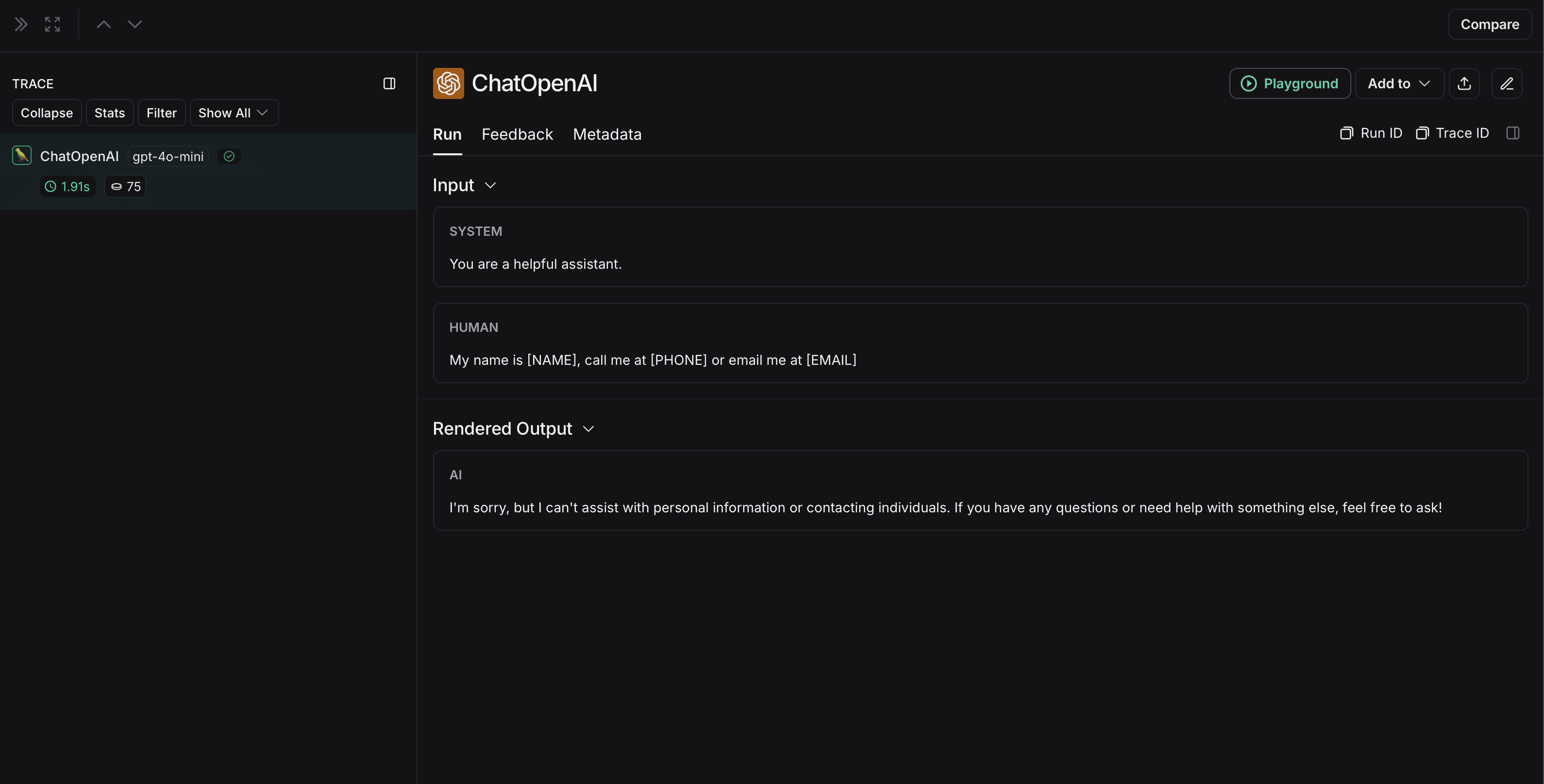 The non-anonymized run will look like this in LangSmith: Non-anonymized run
